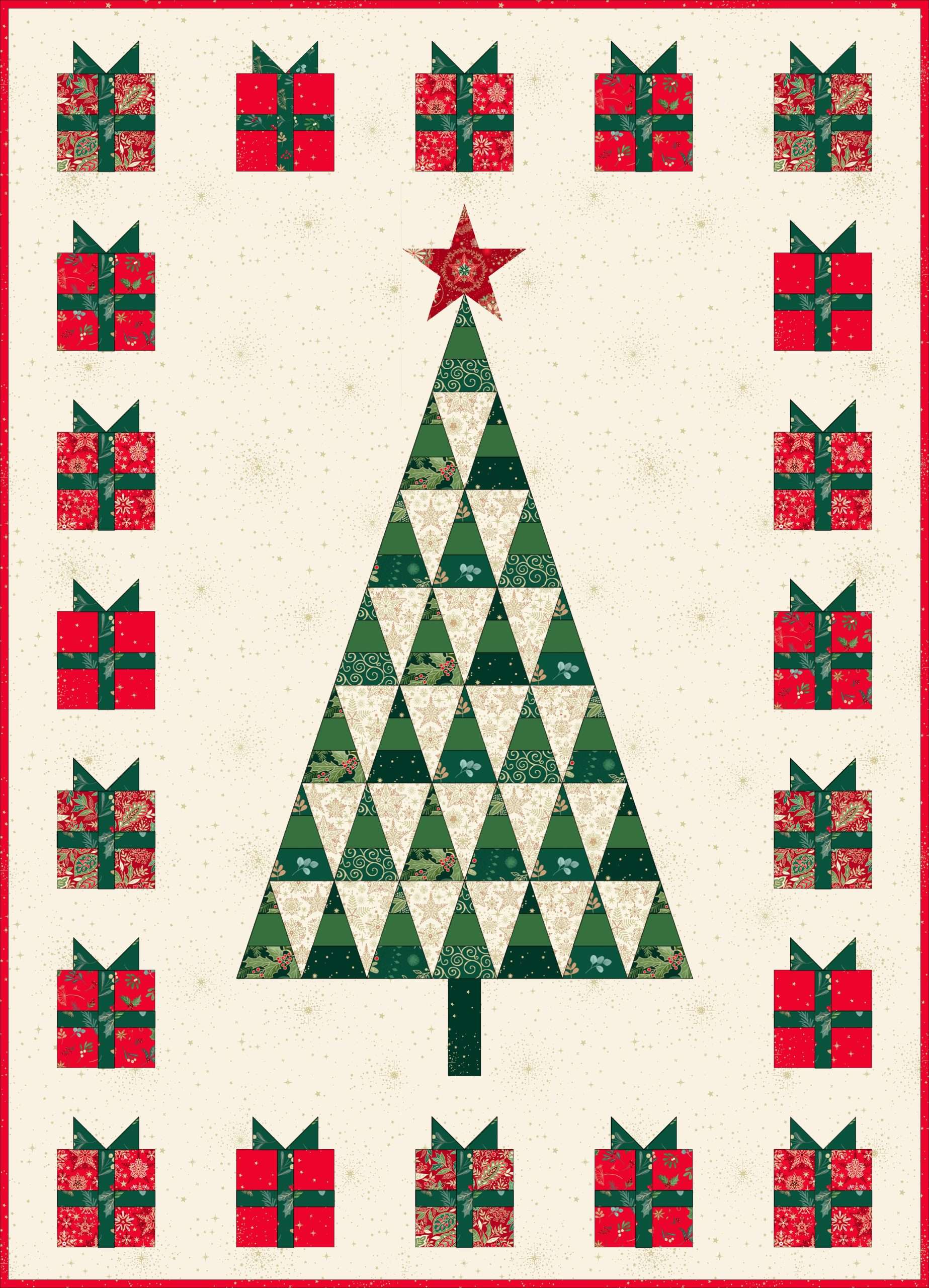 Weihnachtliche Sternenornamente in rot und grün mit dezentem Goldmetallicdruck in unterschiedlichen Größen auf rotfarbigem Hintergrund, 100 % Baumwolle, Breite 112 cm
