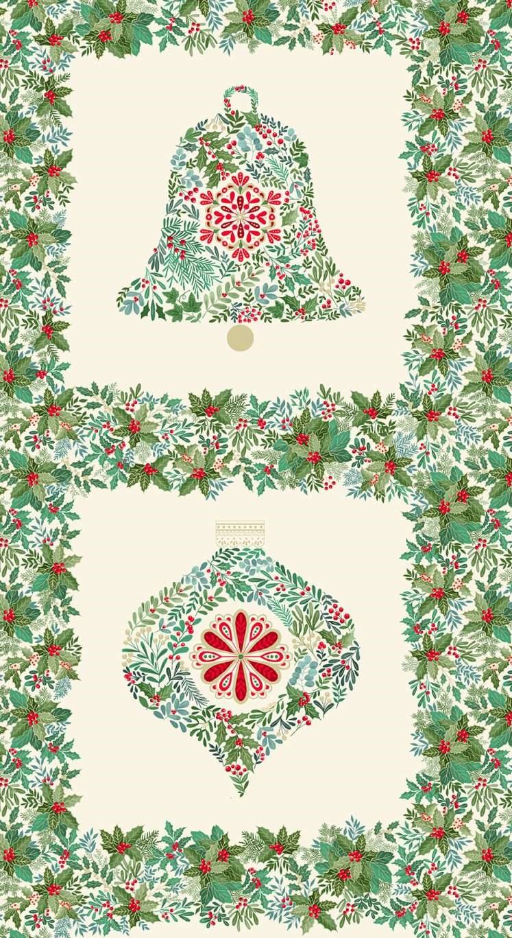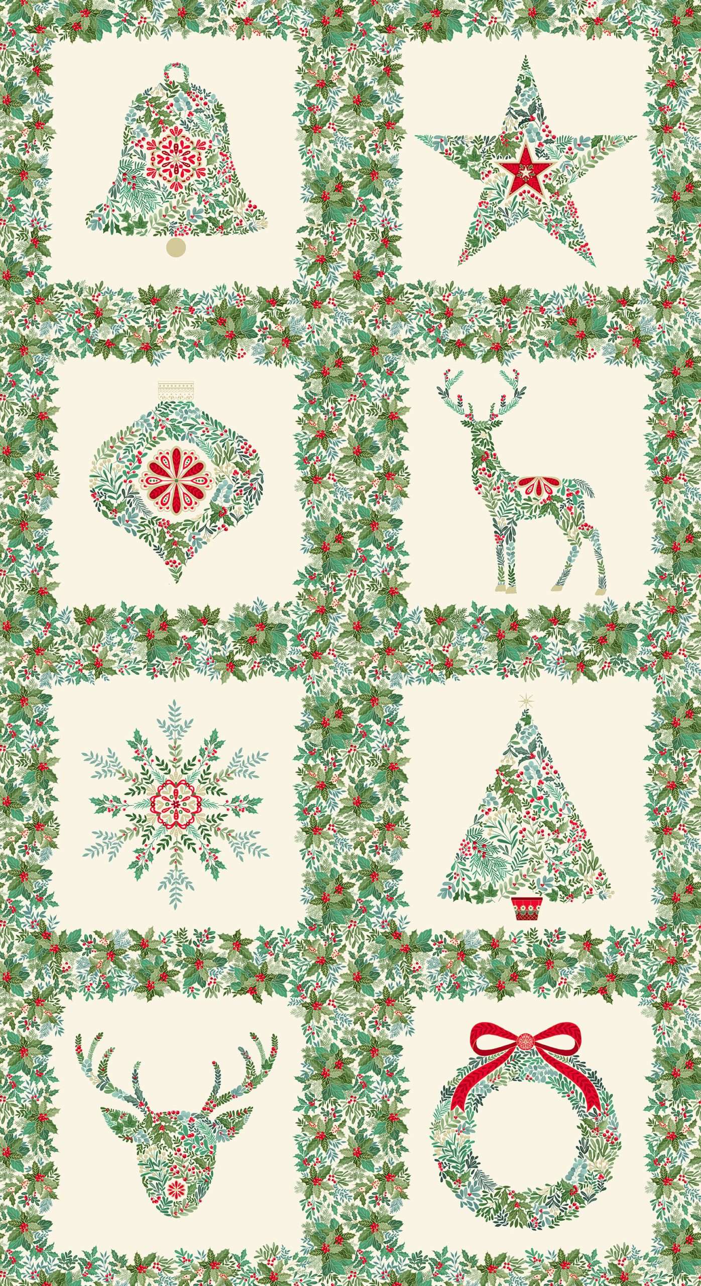 Blockstoff zur Serie "Good Tidings", verschiedene Weihnachtsmotive in Blöcken auf cremefarbigem Hintergrund, teilweise mit dezentem Goldmetallic-Druck, Panelgröße 60 x 112 cm, 100 % Baumwolle