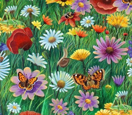 Unterschiedliche bunte Blumen mit kleinen Schmetterlingen und vereinzelt kleine Schnecken auf der Wiese, 100 % Baumwolle, Breite 112 cm