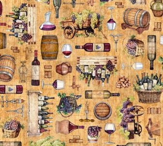 Alles rund um den Wein auf beigefarbigem Hintergrund, ob zum Geschenkbeutel nähen oder für Körbchen, 100 % Baumwolle, Breite 110 cm