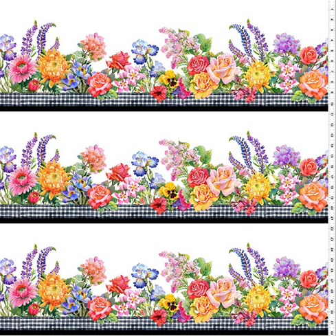Die Borde zur Decoupage-Kollektion, bunte Blumenmischung auf einer schwarz weiß karierten Kante, Laufrichtung mit der Webkante, 4 Mustersätze auf der Breite, 100 % Baumwolle, Breite 112 cm