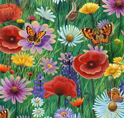 Unterschiedliche bunte Blumen mit kleinen Schmetterlingen und vereinzelt kleine Schnecken auf der Wiese, 100 % Baumwolle, Breite 112 cm
