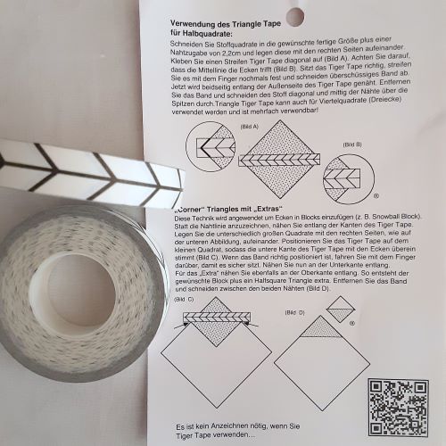 Patentiertes selbstklebendes Band, um perfekte Halb- und Viertelquadrate zu erstellen. Anwendung: zwei gleich große Stoffquadrate rechts auf rechts zusammenlegen. Einen Streifen Tiger Tape diagonal auf die Quadrate legen, sodass die aufgezeichnete Mittellinie die Ecken trifft. Jetzt beidseitig entlang der Außenlinien des Taps nähen, das Band nun entfernen und diagonal über die Spitzen schneiden. Fertig ist das perfekte Halbquadrat. Band ist wiederverwendbar. Inhalt: 2 Rollen: a 13,7 m, 12 mm breit
