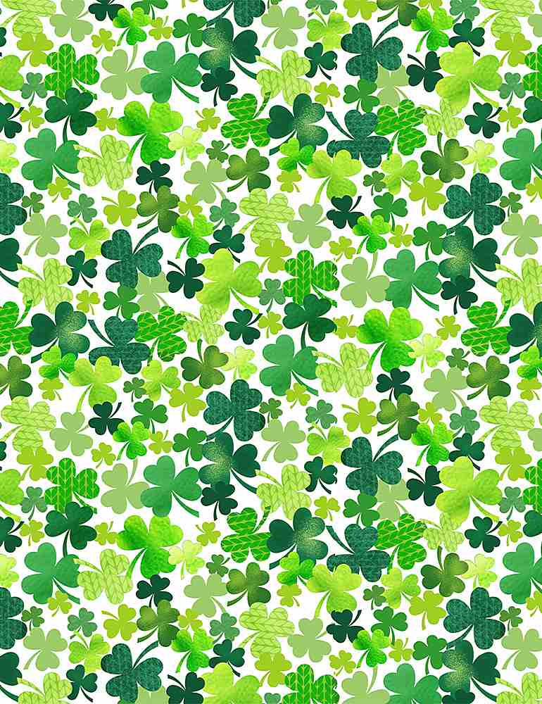 Kleeblätter: unterschiedlich groß sowie hell und dunkelgrün dicht an dicht auf Weiß, 100 % Baumwolle, Breite 112 cm