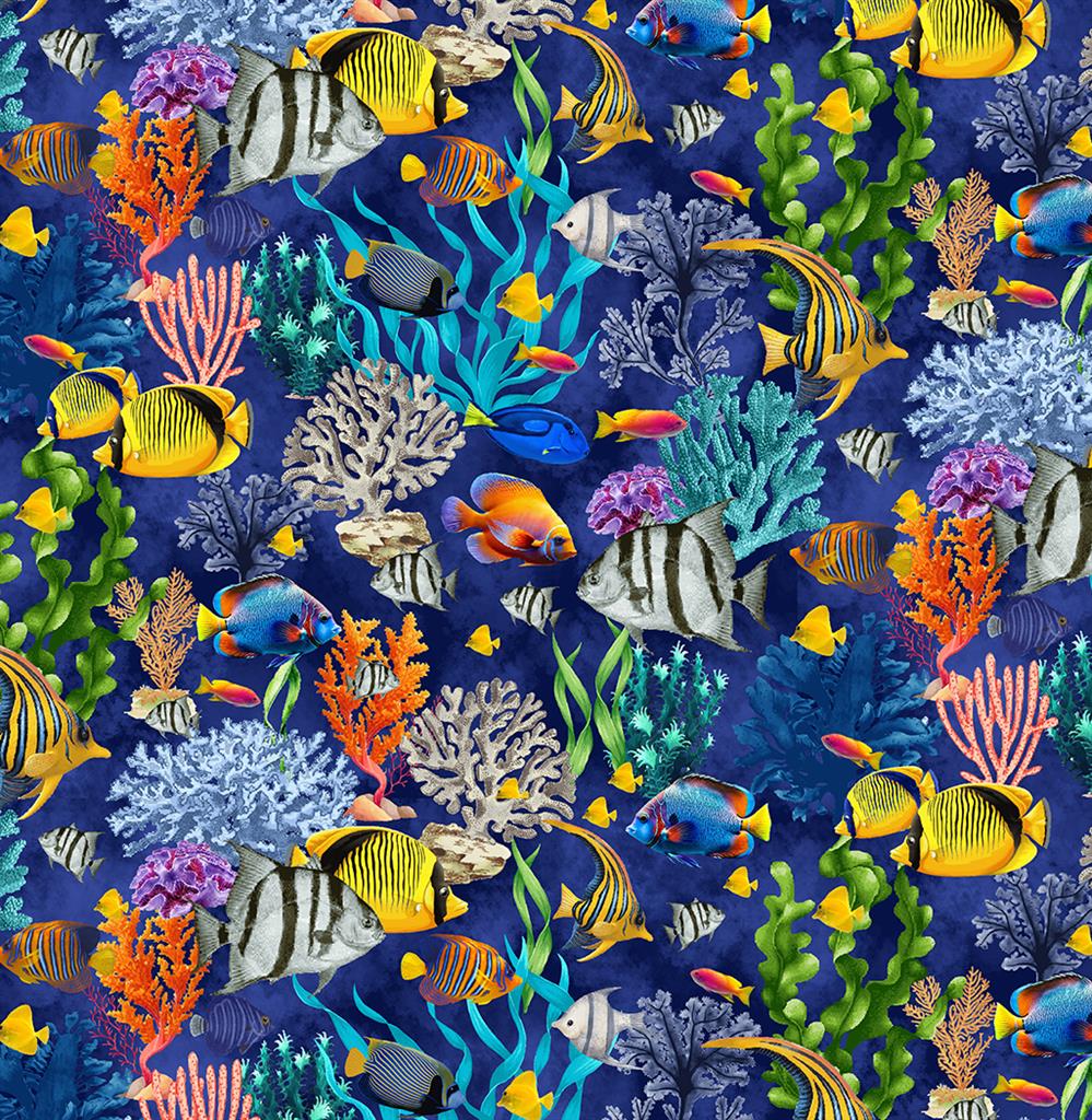 Bunte große und kleine Fische sowie Korallen auf Dunkelblau, Größenorientierung: Fisch schwarz/weiß: 6 x 4 cm, 100 % Baumwolle, Breite 110 cm