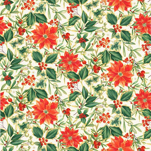 Weihnachtssterne rot mit grünem Blattwerk teilweise goldgerahmt auf cremfarbigem Hintergrund, 100 % Baumwolle, Breite 110 cm