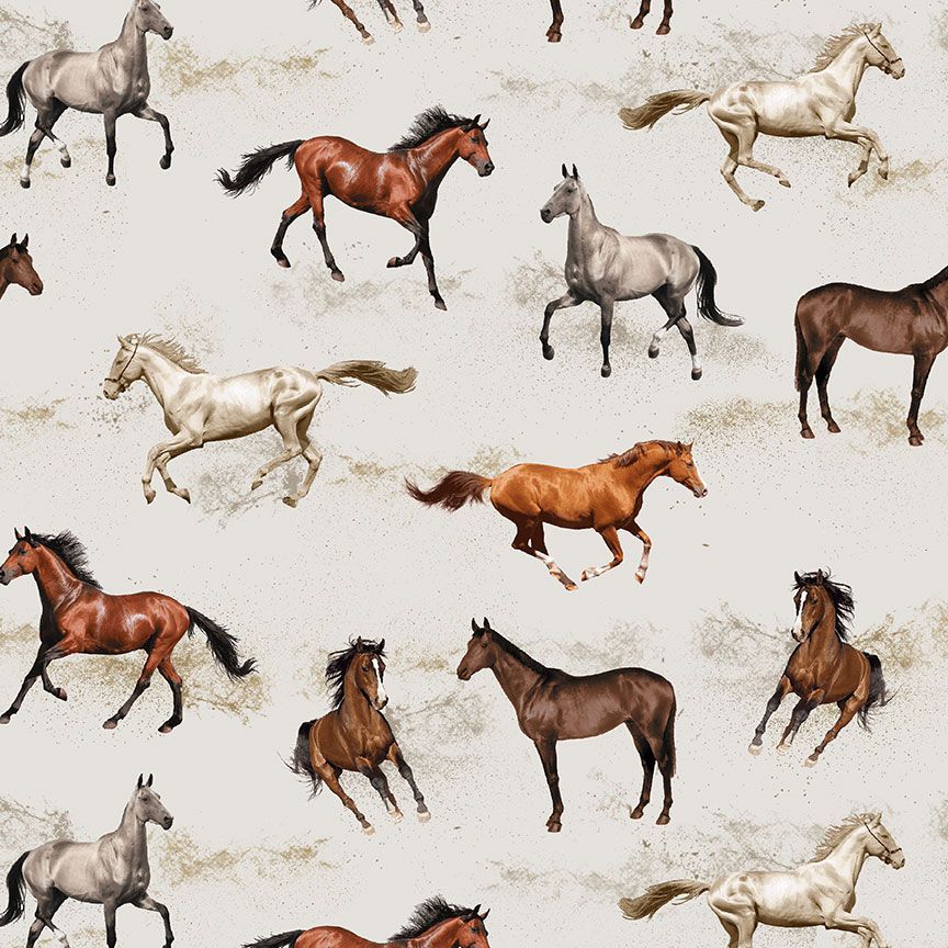 Authentische Pferde in verschiedenen Farben auf hellem Grau, Größenorientierung: hellgraues Pferd incl. Beine und Schwanz 6 x 6 cm, 100 % Baumwolle, Breite 112 cm